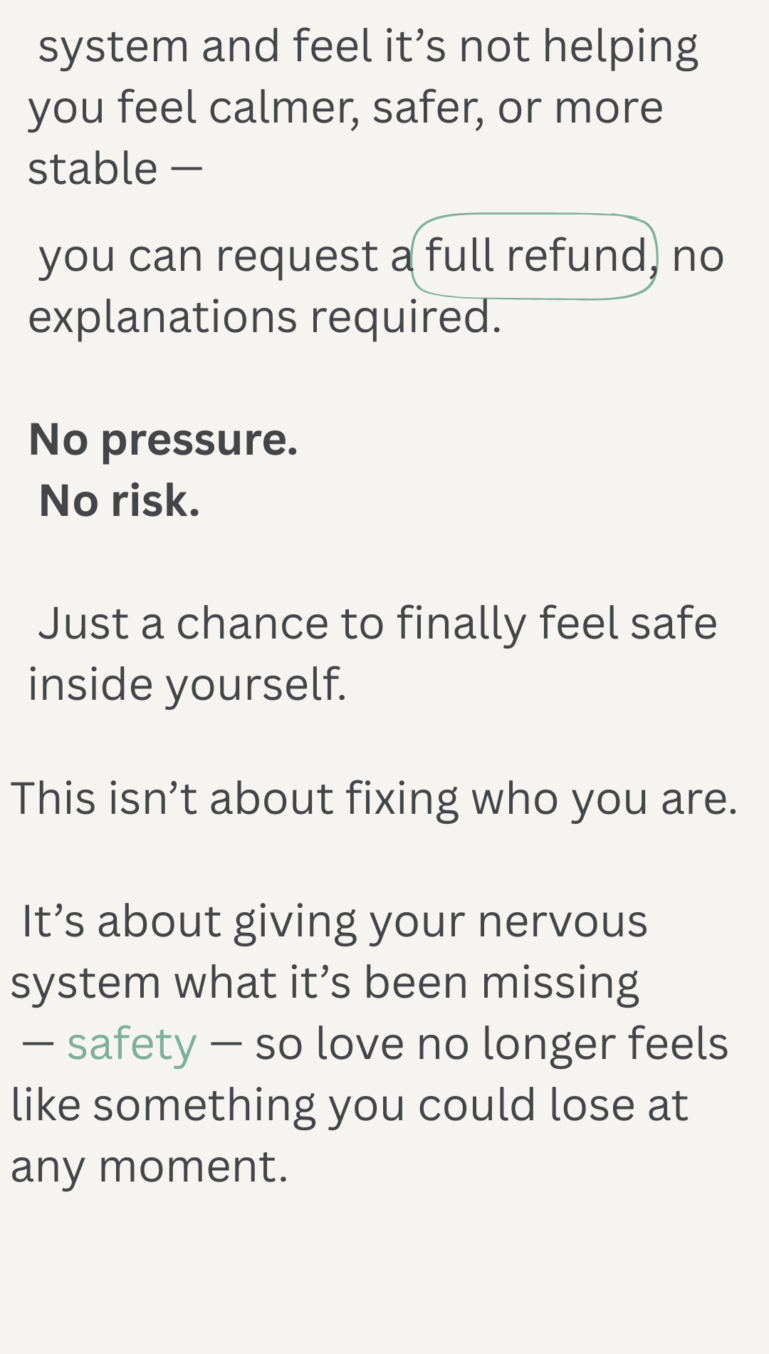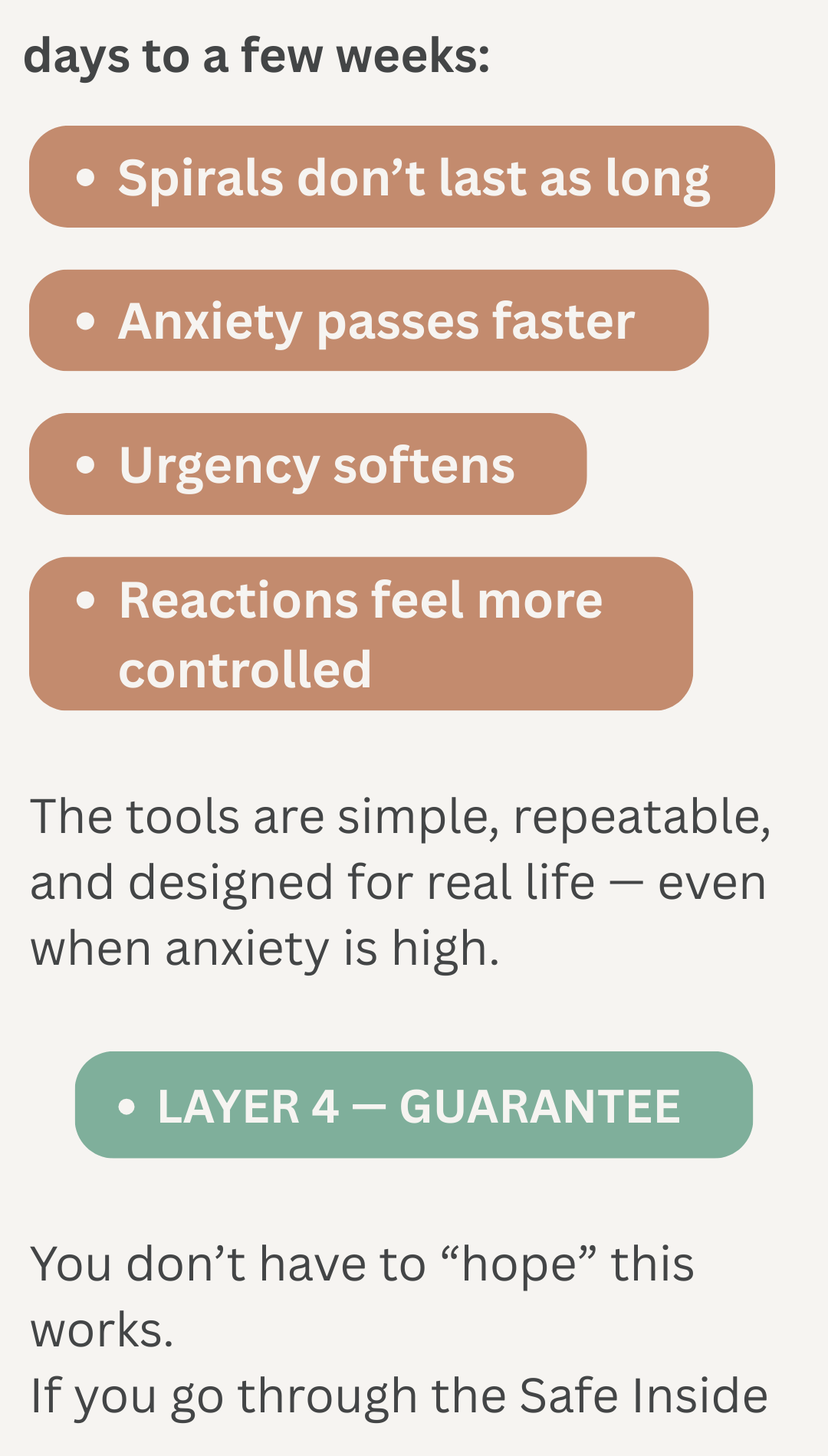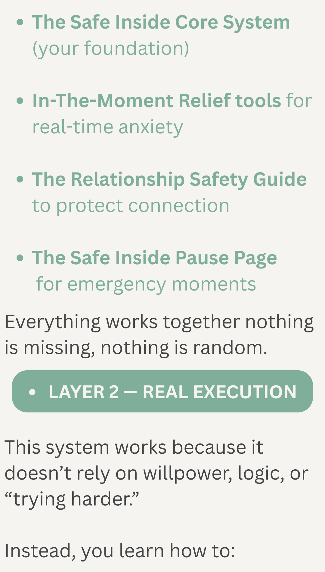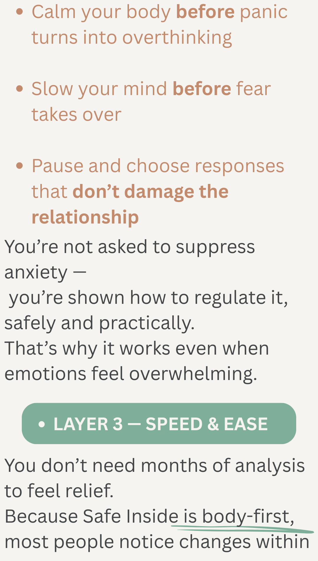The Safe Inside system helps you calm your body when anxiety is triggered, quiet your mind before it spirals, and respond without fear or urgency, so within days to weeks you feel emotionally safe inside yourself, stop misreading connection as danger, and protect the relationship instead of unintentionally pushing it away.